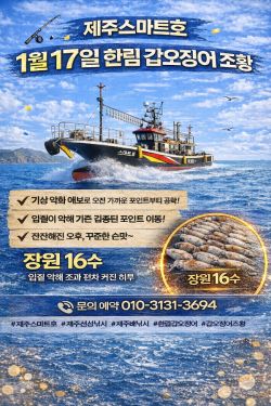 ???? 제주스마트호 1월 17일 한림 갑오징어 조황오늘은 오후 기상 예보상 파도가 강해질 것으로 예상되어기존 포인트까지 바로 진입하지 못하고가까운 포인트에서 낚시를 시작했습니다.하지만 물돌이 이후에도 입질이 살아나지 않아상황 판단 후 기존 검증된 포인트로 이동했습니다.이동 후에는폭발적인 마릿수는 아니었지만간간이 입질이 이어지며 꾸준히 얼굴을 보여주었습니다.오후 들어서는예보와 달리 바다도 점점 잔잔해졌고,집중한 분들은 끝까지 손맛을 보셨습니다.???? 장원 16수✔ 오늘처럼 입질이 약한 날에는 개인별 집중도·운용 차이로 조과 편차가 큰 하루였습니다.조건만 맞아주면 충분히 가능성 있는 흐름이며,기상 안정되면 다시 기대해볼 만한 상황입니다.???? 출항지 : 한림항조황 공통 해시태그코드 복사#제주스마트호 #제주선상낚시 #제주배낚시#한림갑오징어 #갑오징어조황 #제주갑오징어#갑오징어낚시 #선상에깅 #조과편차#한림항출항 #제주낚시 #실시간조황 ======= 제주 스마트호 예약안내 ======== 스마트호는 21년 건조된 9.77 낚시전용선으로 최신의 장비와 편의시설로 조사님들을 모시겠습니다. 정확한 데이터를 기반으로 포인트 진입이 가능합니다. 그래서 스/마/트/호 입니다. 제주 스마트호만의 조황을 확인해 보세요~! ^^ ■ 문의전화 : 010-3131-3694 ■ 오시는길 : 한치, 갈치 : 제주시 건입동 918-57 제주항2부두좌측 어선정박지 http://naver.me/xB4oMF8u 갑오징어 : 제주특별자치도 제주시 한림읍 한수리 906-15 한림항 제주특별자치도 서귀포시 안덕면 사계항 http://naver.me/5peDJAjt 제주특별자치도 서귀포시 서귀동 758-4 서귀포항 여객선터미날 ■ 실시간 예약 바로가기 : http://jjsmartho.sunsang24.com ■ 계좌안내 : 수협 / 010-3131-3694-0 / 강양수 기업 / 010-3131-3694 / 강양수 ■ 네이버 제주 항공권 조회하기 : https://store.naver.com/flights